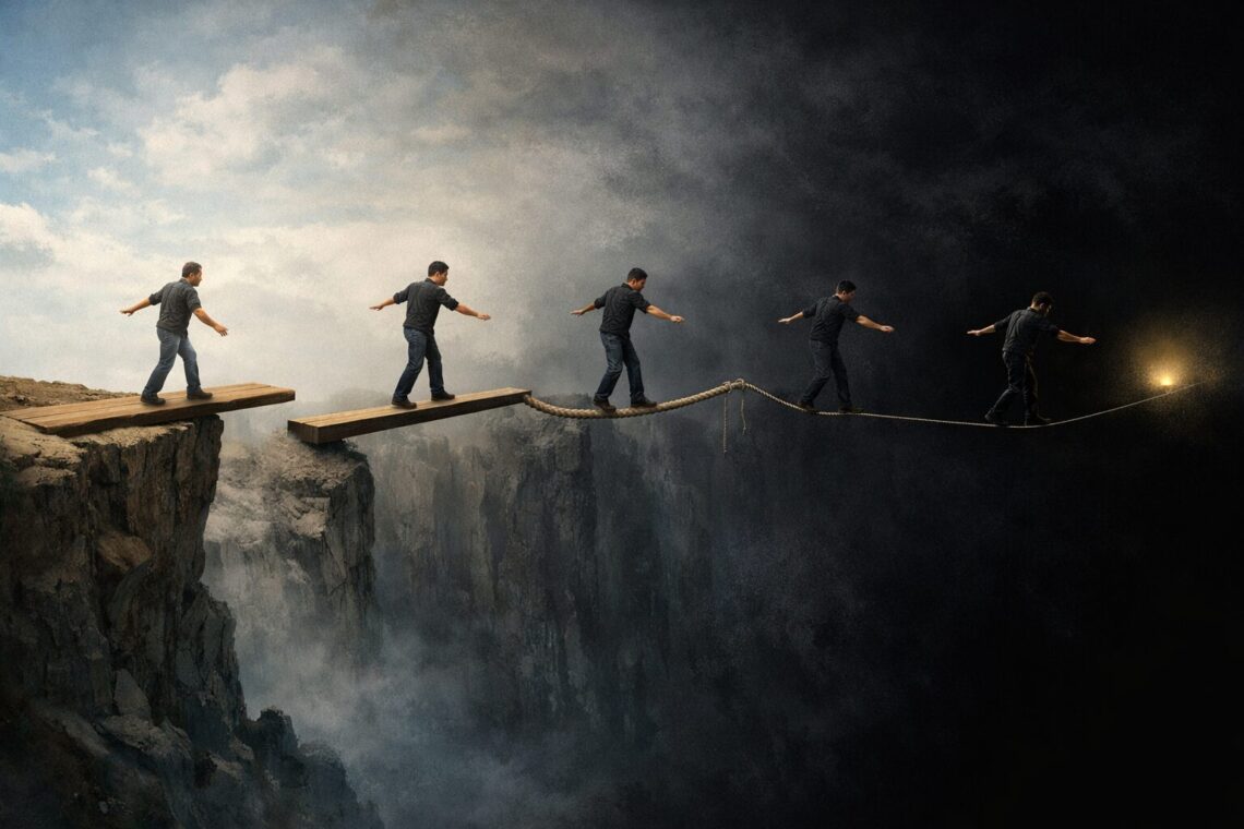Creating something when you have skin in the game – when you are sacrificing something to do it – is like walking off a cliff onto a wide plank. As you go forward, the plank becomes a balance beam 4 inches wide and you get scared. Then the beam becomes a rope and you have to keep walking across to get to the other side, but you feel like you’re going to fall off any moment. The rope becomes string, then a thread. It turns dark, and you hope to heaven you can make it.